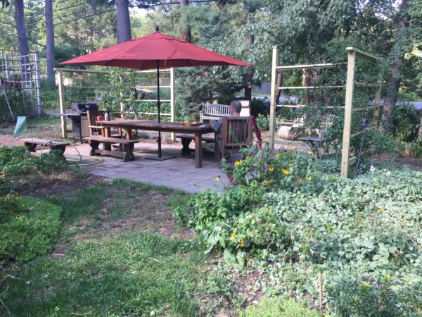 Karl built the Pear Tree Patio Espalier Trellis over 2 days. Sunday, 8/26, he created the frame using 4×4’s, 2×4’s, and 1×1’s. He dug 6 holes for the 4×4’s, and cemented them in place. The frame became set over 3 days, 8/26-8/29. Then, this Wednesday,8/29, he finished the project with the horizontal wooden supports. We may use wire supports in the future, but we like the look of the wood while we are beginning to train the branches to the frame.